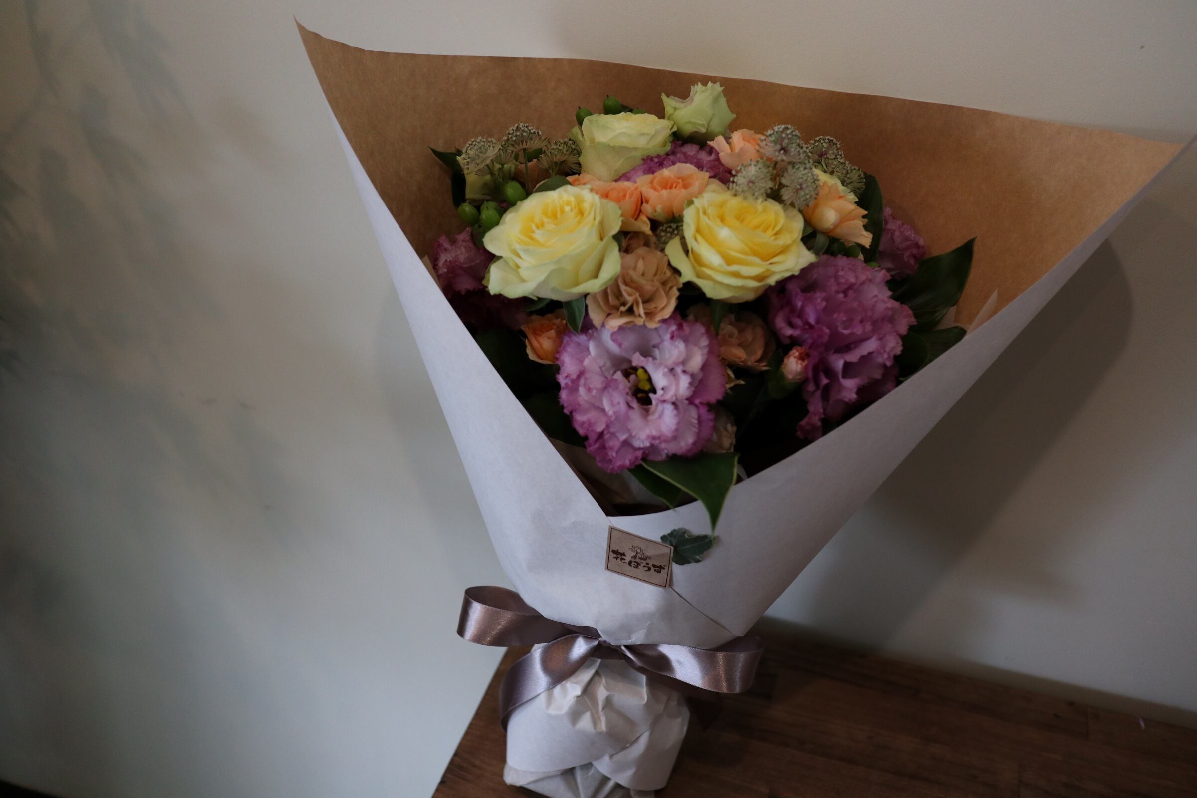 bouquet:お花を束ねて、ラッピングで包みます。